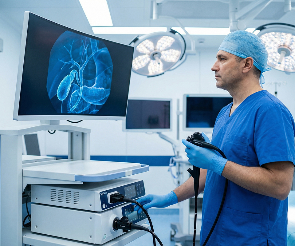 Sistema de visualización directa que permite observar con alta resolución los conductos biliares y pancreáticos durante procedimientos endoscópicos.